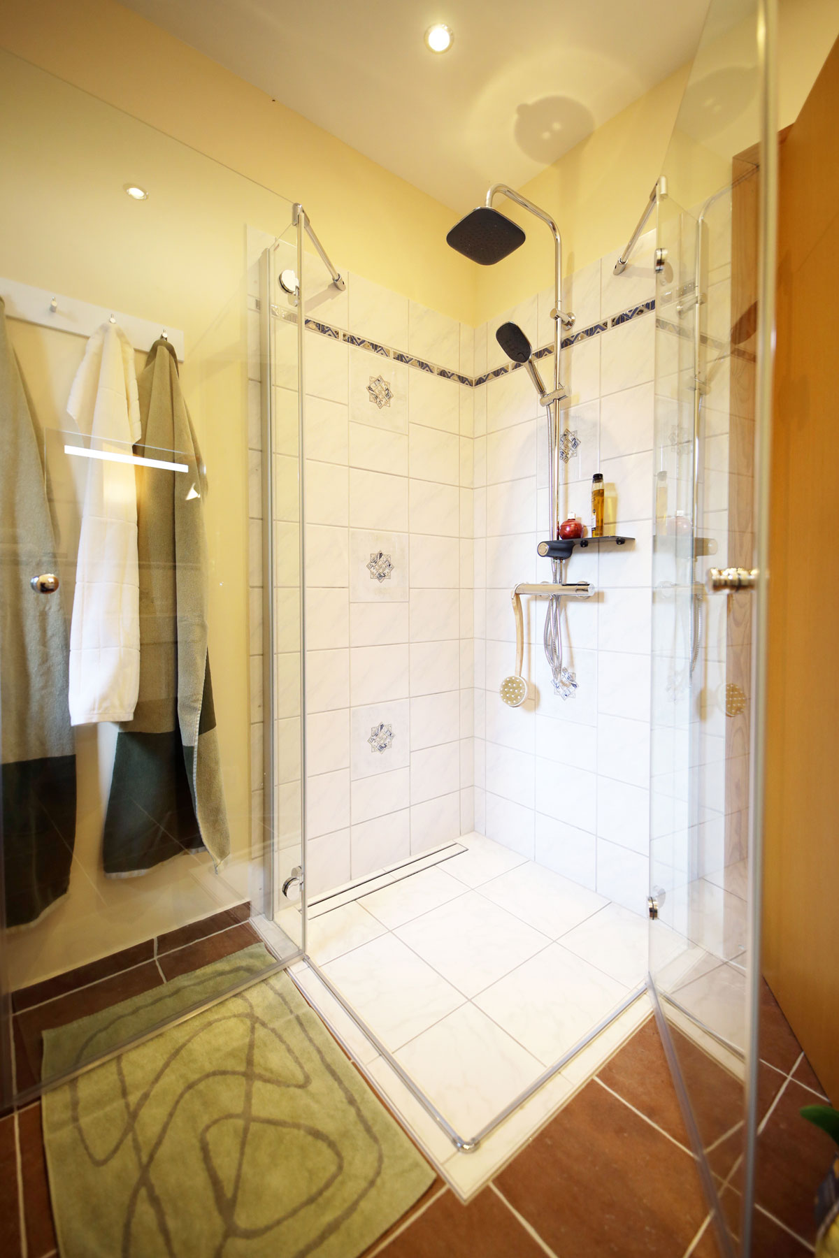 Das modern ausgestattete Bad verfügt über einen großen Waschtisch, eine bodengleiche Duschkabine und ein WC. Handtücher und Duschtücher sind im Wäschepaket enthalten.