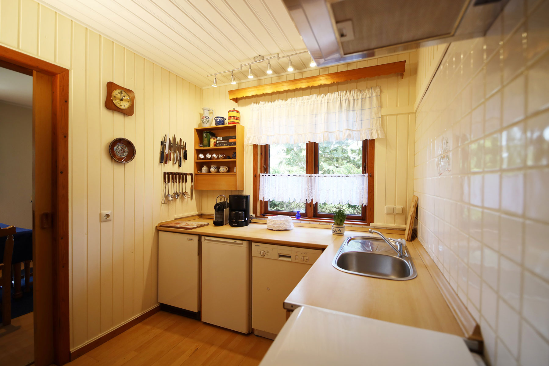Unsere Küche ist kompakt und praktisch ausgestattet. Sie finden hier Kühlschrank und Tiefkühlschrank, Elektroherd mit Backofen und Abzugshaube sowie einen Geschirrspüler.